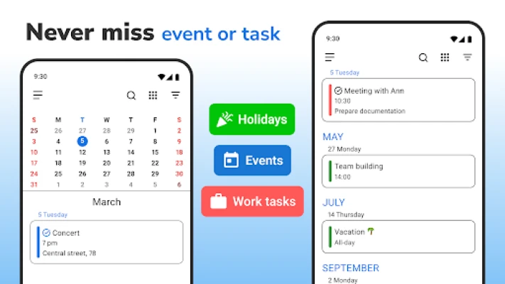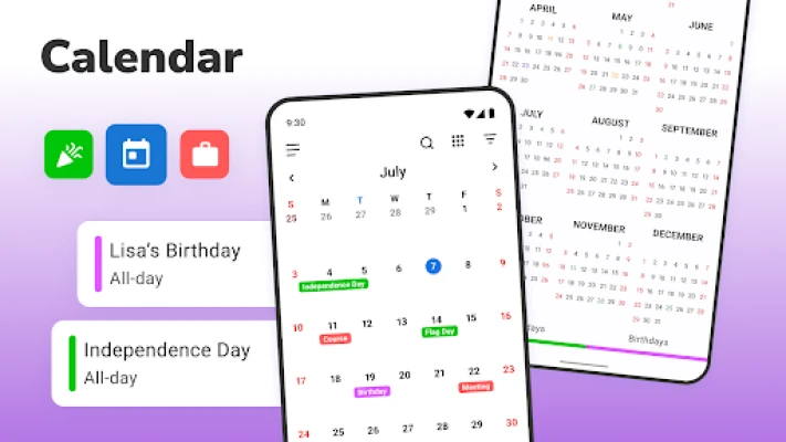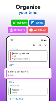 *Calendar* piedāvā plašas personalizācijas iespējas, lai tas pielāgotos tieši jūsu stilam. Izvēlieties starp elegantu tumšo un gaišo tēmu, kā arī krāsu kodējiet notikumu veidus, lai vizuāli atšķirtu darba pienākumus no personīgajiem plāniem. Gūstiet pilnīgu pārskatu par savu mēnesi, nedēļu vai dienu, ērti pārslēdzoties starp notikumu saraksta, gada, mēneša, nedēļas un dienas skatiem. Turklāt, tā nemanāmi sinhronizējas ar citiem kalendāriem, piemēram, Google, Samsung un MI Calendar, apvienojot visus jūsu plānus vienuviet. Integrētie uzdevumu pārvaldības rīki ļauj jums viegli izveidot, rediģēt un pārraudzīt savus uzdevumus līdzās notikumiem.