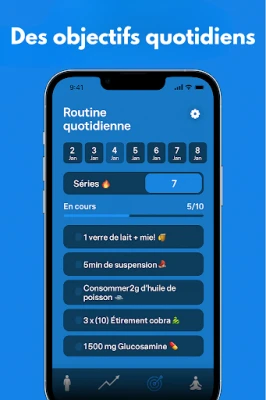Katru dienu "Grandir" piedāvā mērķtiecīgus stiepšanās vingrinājumus, kas radīti, lai stimulētu mugurkaula veselību, uzlabotu stāju un veicinātu ķermeņa garuma pieaugumu. Šīs rūpīgi izstrādātās rutīnas ir viegli integrējamas jūsu ikdienā. Lai nodrošinātu konsekvenci un palīdzētu sekot līdzi progresam, lietotnē ir iekļauts interaktīvs kalendārs, kas garantē, ka jūs nekad nepalaidīsiet garām nevienu svarīgu nodarbību. Papildus tam, "Grandir" sniedz vērtīgus uztura ieteikumus, atklājot, kādi pārtikas produkti var optimāli atbalstīt jūsu ķermeņa augšanas procesus un vispārējo labsajūtu. Jūsu sasniegumi tiek reģistrēti katru mēnesi, ļaujot jums detalizēti sekot līdzi katram centimetram un vērot savu fizisko transformāciju.
