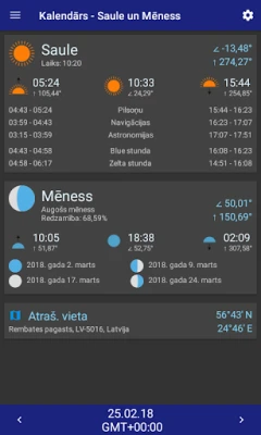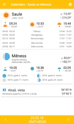 Atklājiet precīzu saules un mēness stāvokli jebkurā pasaules vietā. Uzziniet saullēkta un saulrieta laiku, krēslu, dienas ilgumu, mēness fāzes un citu būtisku informāciju. Plānojiet savu dienu, izprotot debesu norises.
