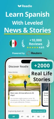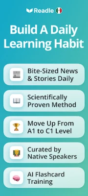 Valodu eksperti Readle ir pārvērtuši reālas ziņas un stāstus par saistošiem un īsiem spāņu valodas mācību kursiem, kas ir pielāgoti tieši jūsu A1 – B2 līmenim. Izmantojot zinātniski pierādītu iegremdēšanās metodi, Readle nodrošina efektīvu spāņu valodas apguvi caur kontekstu, kas palīdz jums ne tikai lasīt, bet arī uzlabot klausīšanās un izpratnes prasmes. Ar vairāk nekā 2000 pieejamiem stāstu kursiem un ikdienas papildinājumiem, jūs nekad nepaliksiet bez jauniem un interesantiem materiāliem, kas aptver plašu tēmu loku – no ceļojumiem un kultūras līdz zinātnei un tehnoloģijām.