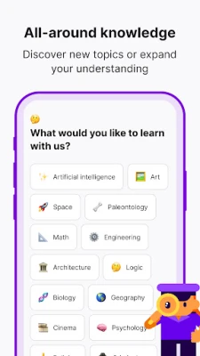 Nibble paver durvis uz plašu un daudzveidīgu zināšanu pasauli. Apgūstiet tēmas, kas svārstās no mākslas, matemātikas, loģikas un vēstures līdz pat personīgajām finansēm, filozofijai, bioloģijai, psiholoģijai un mūsdienu izpratnei par AI, kino, ēdienu un mūziku. Kļūstiet par to interesanto personu, kura spēj dalīties ar aizraujošām atziņām un iesaistīties bagātīgās diskusijās. Mūsu lietotāji atzinīgi novērtē Nibble kā noderīgu un praktisku risinājumu finanšu pratības uzlabošanai, abstraktās mākslas izpratnei un aizraujošai zināšanu apguvei kustībā, izceļot stundu ātrumu, jautrību un patieso interesi, kas padara mācīšanos patīkamāku par laika tērēšanu. Pievienojieties tiem, kuri jau atklājuši, cik viegli un jautri ir mācīties ar Nibble.